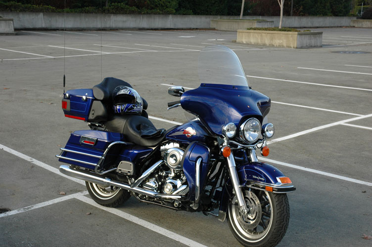 I did do two changes, first was a taller windshield. The original was at a perfect height if you were 5'2", or 6' 8", but in betweeen (I'm 5'11"), the top of the windshield cuts right across my field of vision. Useless! I went with the taller windshield, at least for the winter, and it is really nice. My only gripe is that it's shaped sort of like a mushroom, bulging out on the sides... Hey Harley, how about some style here, straight sides would be much more slick looking. Oh, well, not a problem. The other change was to move the rear passenger pegs up to the top notch. The middle setting put my wifes legs against the rear bag guards, and was uncomfortable for long trips (or even some short ones).